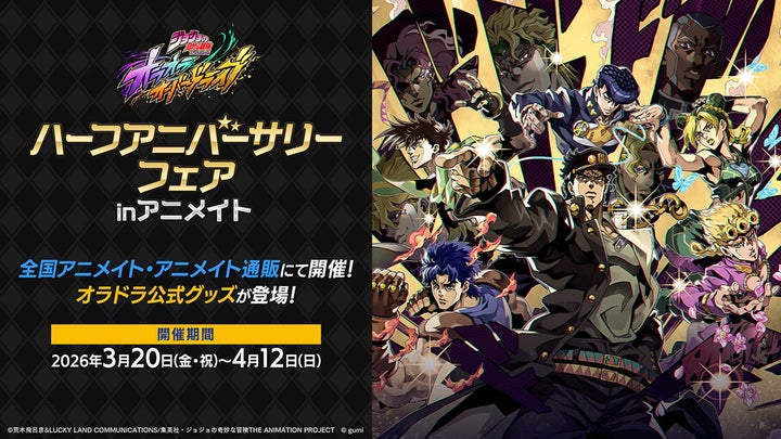 株式会社アニメイトは、アプリゲーム『ジョジョの奇妙な冒険 オラオラオーバードライブ』のゲーム内イラストを使用した新グッズを2026年3月20日より発売します。同日よりハーフアニバーサリーフェアも開催し、ゲーム内アイテムが手に入ります。