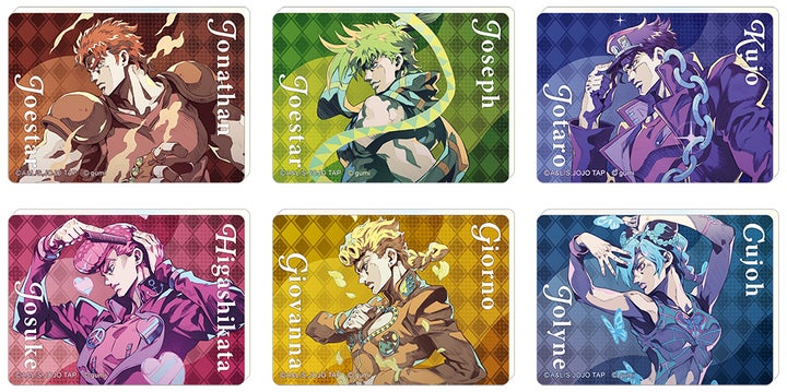 アニメ『ジョジョの奇妙な冒険』のファントムブラッドからストーンオーシャンまでの主人公たち(ジョナサン、ジョセフ、承太郎、仗助、ジョルノ、徐倫)がゲーム用に描き下ろされたイラストを使用した多彩な新商品が登場します。