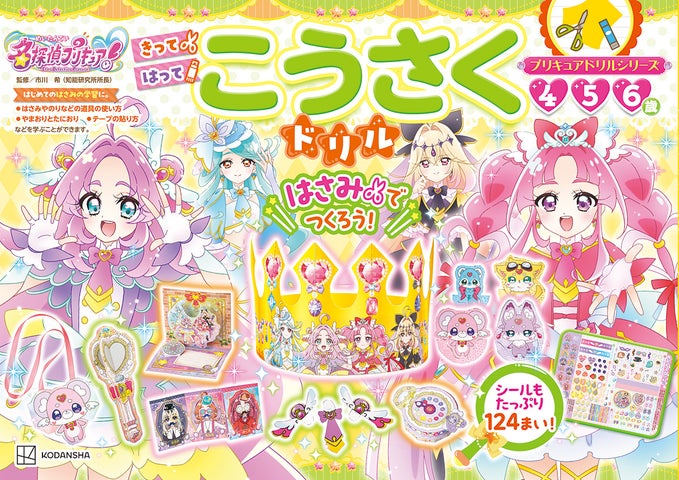 『プリキュアドリルシリーズ めいたんていプリキュア! こうさくドリル』は、プリキュアたちがいっぱいの工作が楽しめる一冊です。プリキュアになりきれるアクセサリーや、プリキットミラールーペの工作も収録されています。簡単な工作から徐々に難易度が上がり、楽しみながらはさみやのりの使い方を習得します。