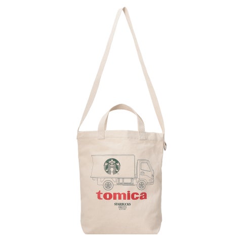 STARBUCKS STAND by BEAMSとトミカの世界観を組み合わせた、シンプルで使いやすいトートバッグです。トラックモチーフのイラストと「tomica」ロゴをフロントに配し、ナチュラルな生成りカラーのキャンバス素材を採用しています。内側にはポケットも備え、日常使いに便利です。
