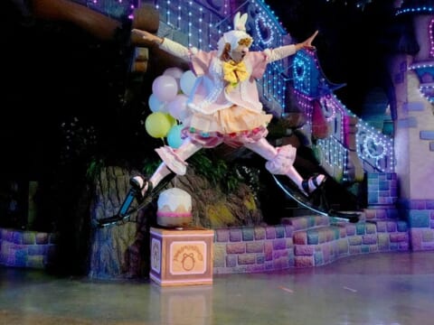 特製のピューロキャロットケーキをみんなでつくるシーンや、うさぎになりきって飛び跳ねる演出など、参加型の内容です。コスチュームのスカートは、ジャンプをするとふわっとお花が咲いたように見えるよう、お花畑をイメージして作られています。