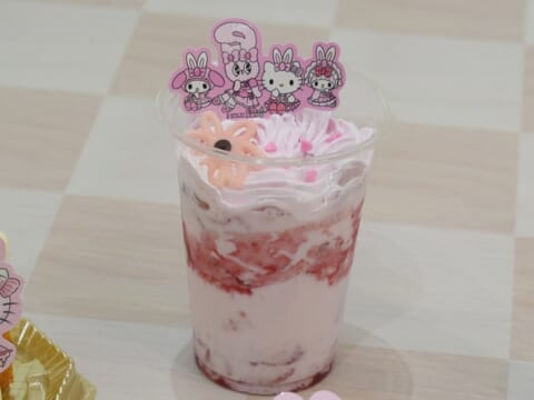 コラボレーションでは、オリジナルグッズも発売します。ハート型ミラーやフラットポーチなど、ここでしか手に入らない特別なアイテムを展開します。また、コラボレーションフードとして、「エスターバニー×サンリオピューロランド 果肉たっぷり♡スペシャルいちごミルク」が登場。いちごの果肉をたっぷりと入れたいちごミルクに、甘酸っぱいフランボワーズソースを加えた、見た目も味も楽しめるドリンクです。