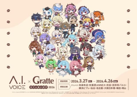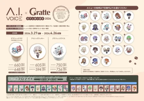 A.I.VOICEとアニメイトカフェGratteのコラボ企画「カフェあいぼす」が、2026年3月27日からアニメイト10店舗で開催されます。限定メニューや特典を提供し、ファンにとって特別な体験を創出します。