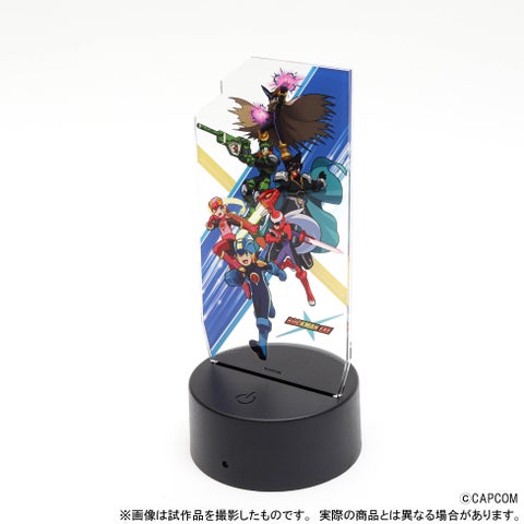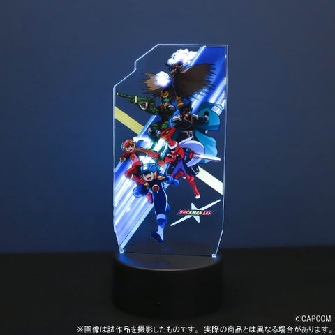 本製品は、駆け抜けるロックマンたちが描かれた新規描き起こしイラストを使用しています。2枚のアクリルが重ねられ、LEDライト内蔵の台座にセットすることで、立体感と光の演出が楽しめます。