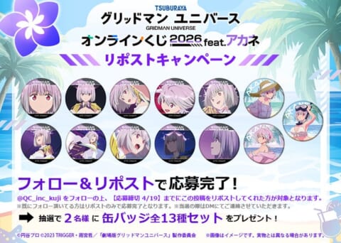 クオリティコンフィデンス株式会社は、『グリッドマン ユニバース』の「新条アカネ」グッズのみをラインナップした新作オンラインくじ「『グリッドマン ユニバース』オンラインくじ 2026 feat.アカネ」を販売中です。