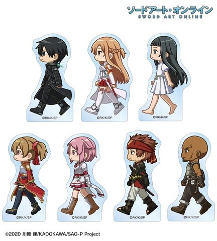 キリト、アスナ、ユイ、シリカ、リズベット、クライン、エギルのちびキャラがデザインされた自立式アクリルマスコットです。
