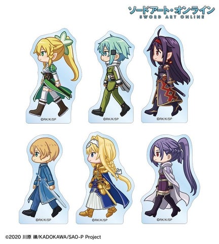 リーファ、シノン、ユウキ、ユージオ、アリス、ミトのちびキャラがデザインされた自立式アクリルマスコットです。