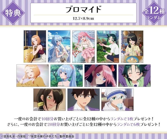一度の会計で10回分購入ごとに特典ブロマイド(全12種)の中からランダムで1枚、20回分購入ごとにランダムで6枚プレゼントします。