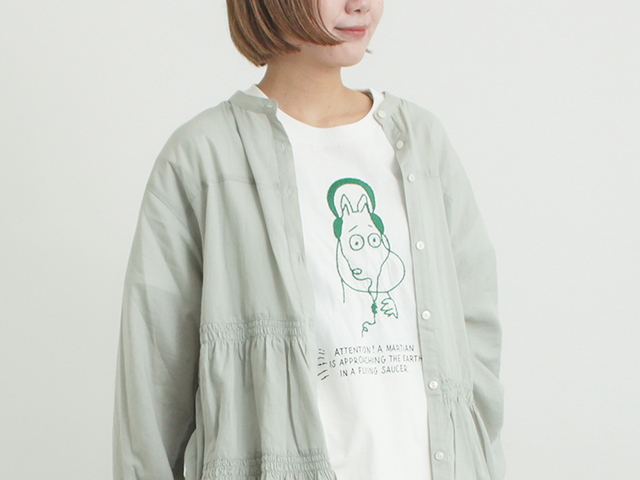ヘッドフォンをしたムーミンの姿が新鮮で、思わずクスッと笑ってしまうような刺繍Tシャツです。空飛ぶ円盤のUFOに乗った火星人が地球着陸を企てているというニュースを聞いている漫画の一コマを刺繍とプリントで表現しています。このムーミンの刺繍は限定デザインです。