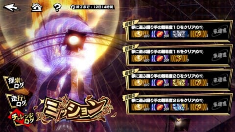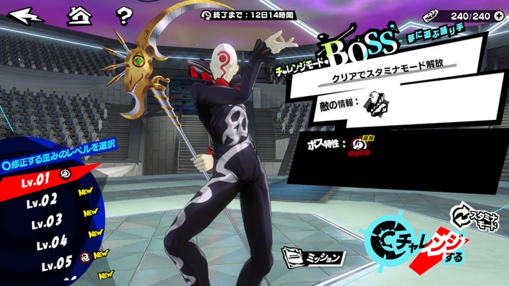 歪みレベルに応じた強大なボスを撃破し、主人公の専用武器などと交換可能な「喚喜のメダル」や「出目指定サイコロ」を集めます。また、撃破済みのレベルには“スタミナモード”が解放されます。“スタミナモード”は体力を消費しての挑戦が可能で、撃破すると「『反逆』のコイン・異」などの報酬を獲得できます。