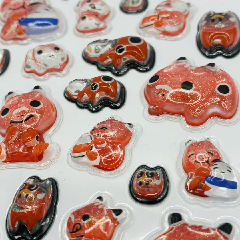 「赤べこぷっくりキラキラシール」は、ぷっくりとした厚みとキラキラとした質感が特徴です。この立体感と輝きが、スマートフォンケースやノート、キャリーケースなど、貼るアイテムに存在感と彩りを加えます。また、硬めの素材を使用しているため、へこみにくくしっかりとした作りを実現しています。