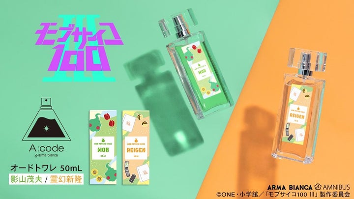 影山茂夫、霊幻新隆をイメージしたA:code オードトワレが登場します。香水としてはもちろん、ルームフレグランスやインテリアとしても活用できるアイテムです。日常生活でキャラクターとの日常を楽しめます。