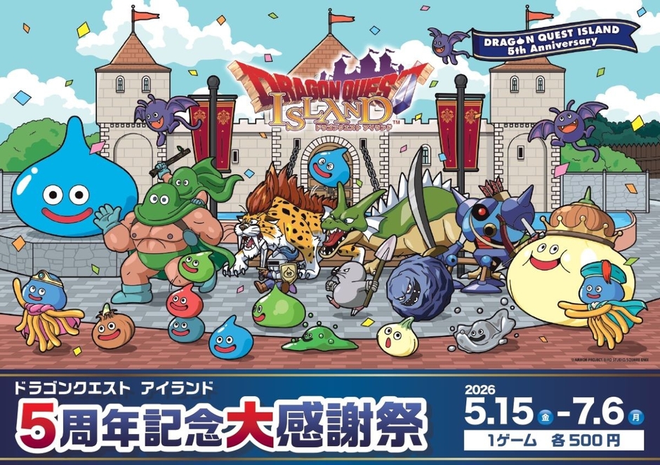 ニジゲンノモリの大人気アトラクション「ドラゴンクエスト アイランド」は、この春5周年を記念し、「ドラゴンクエスト アイランド 5周年記念大感謝祭」を開催いたします。その第2弾として、2026年5月15日(金)から7月6日(月)までの期間限定で、「5周年記念わくわくミニゲームチャレンジ」を開催します。縁日屋台が登場し、4種類のミニゲームと限定ノベルティを提供いたします。