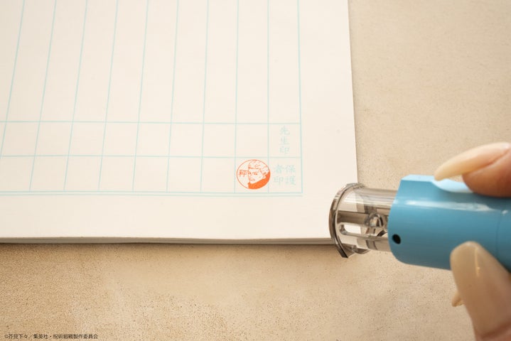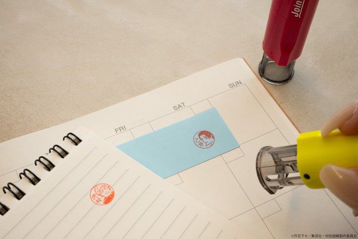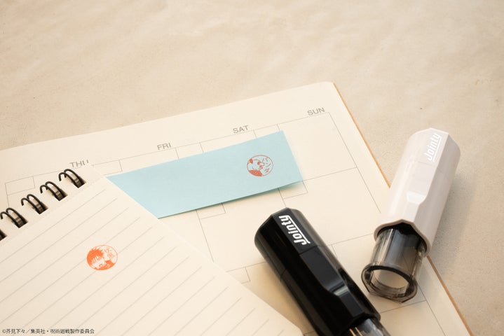 今回先行発売されたセルフインクタイプは、インクが内蔵されており、朱肉なしでそのまま押せる手軽さが特徴です。使いやすいキャップレスタイプを採用しており、オフィスでの付箋やメモ、ご家庭での手帳やお子さまの連絡帳、音読カードなど、日常の様々なシーンで『呪術廻戦』のキャラクターたちと共に活用できます。