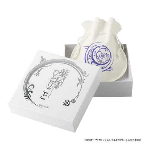 それぞれのブレスレットには、持ち運びに便利な専用ポーチが付属します。猫猫モデルには植物のモチーフに子猫のシルエットがデザインされたポーチ、壬氏モデルには霞文様に月と花のモチーフがデザインされたポーチです。さらに、銀色の箔押しが優美な特製ボックスに収めてお届けします。特製ボックスの天面には作品ロゴとキャラクターごとのモチーフが箔押しされています。