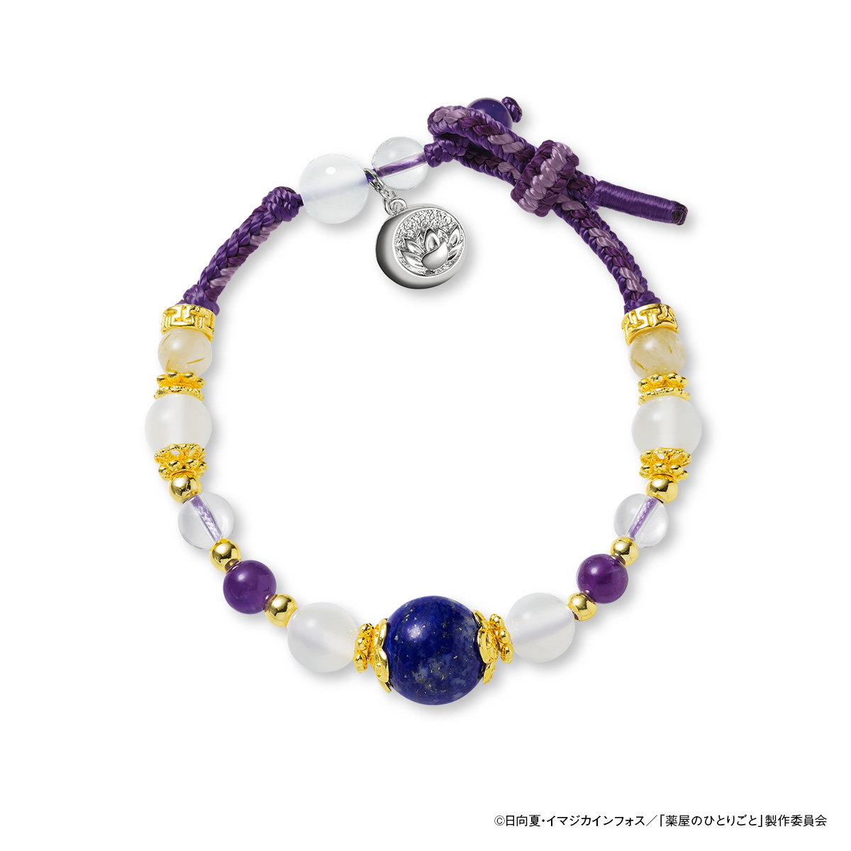 壬氏をイメージした紫色の手編みの紐に、青や紫、金色など優雅な彩りの天然石を連ねています。中央には壬氏の衣装の色にちなんだラピスラズリを配し、やさしく輝くムーンストーンや高貴な印象のアメシストをあしらいました。メタルチャームには、月と花のモチーフが立体的に浮かび上がります。