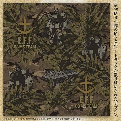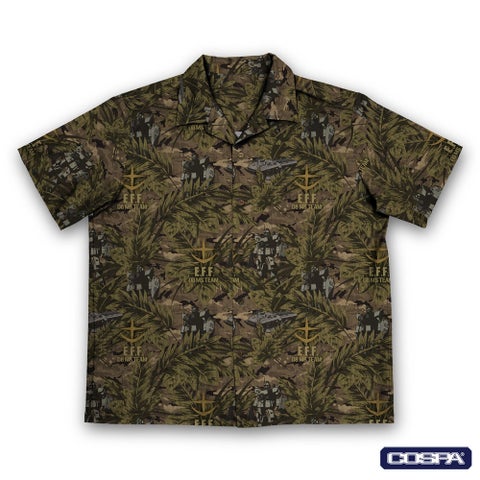 このアロハシャツは、『機動戦士ガンダム 第08MS小隊』の世界観を細部にまで落とし込んだデザインが魅力です。アロハの柄には、劇中に登場するモビルスーツ(MS)とホバートラックが散りばめられています。
