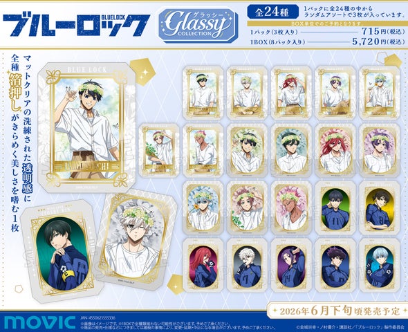TVアニメ『ブルーロック』より、クリアシートにマット加工を重ねたすりガラス風の新グッズ「グラッシーコレクション」が登場します。2026年9月下旬頃発売予定で、1パック3枚入り715円(税込)です。現在、全国のアニメイト、アニメイト通販、ムービック通信販売等で予約を受け付けています。洗練された透明感と箔押しの装飾が特徴のこのアイテムの詳細や購入方法を詳しく紹介します。ぜひ参考にしてください。