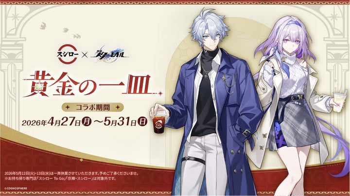 2026年4月27日(月)から、スシローと『崩壊:スターレイル』のコラボレーション「黄金の一皿」を開催します。オンパロスをテーマに、コラボ限定ピック付きのおすし、限定ステッカー付きスイーツ、コラボ限定すし皿付きソフトドリンクなどのコラボ商品が登場します。