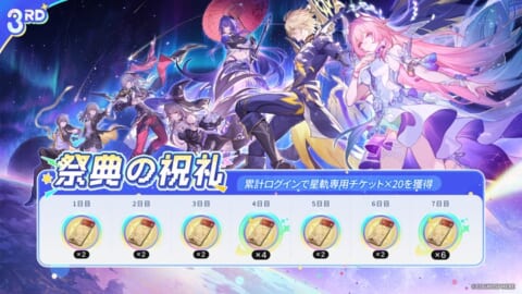 3周年を記念し、ログインイベント「祭典の祝礼」を開催します。期間中、累計ログインを行うことで星軌専用チケット×20を獲得できます。この機会にログインして豪華報酬を手に入れましょう。