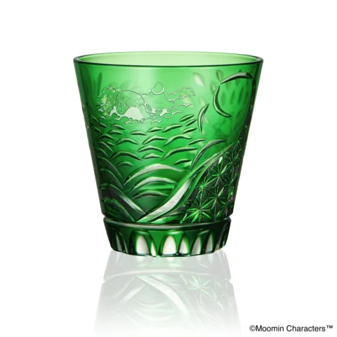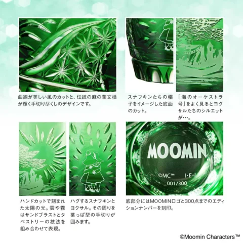 ハンドカットの曲線で描いた空に舞い上がる風の流れの内側には、伝統の麻の葉文様が職人の手切りで施されています。底周りにはスナフキンの帽子をイメージしたカットが並び、グラスの底部分にはMOOMINロゴとエディションナンバーを刻印しています。