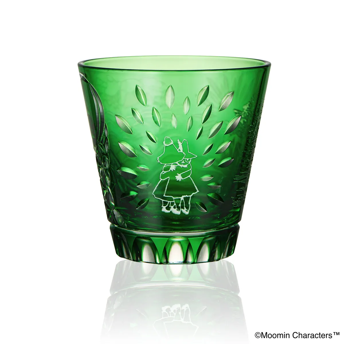 シャープで奥深いハンドカットでグラス全面に草や花、彗星といったモチーフがちりばめられ、底周りには伝統の玉カットでムーミントロールのおしりとしっぽを表現しています。グラスの底部分にはMOOMINロゴとエディションナンバーを刻印しています。