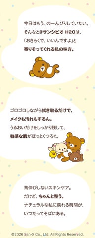 「今日はもう、のーんびりしていたい。そんなときサンシビオ H2Oは、『おきらくで、いいんですよ』と寄りそってくれる私の味方。ゴロゴロしながら拭き取るだけで、メイクも汚れもするん。うるおいだけをしっかり残して、敏感な肌がほっとくつろぐ。背伸びしないスキンケア。だけど、ちゃんと整う。ナチュラルな私に戻れる時間が、いつだってそばにある。」