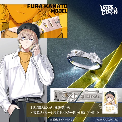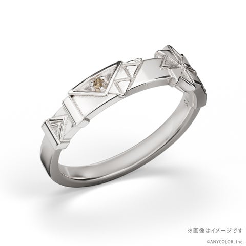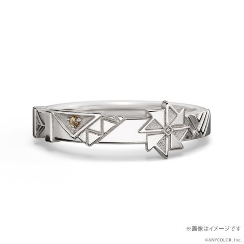 風楽奏斗さん監修によるファッションリングです。普段の衣装やネックレスをモチーフとし、つや消し(マット加工)をポイントで施すことで立体感と繊細な模様を表現しました。正面には太陽を象徴する石とされる「シトリン」を留め、【希望】・【幸福】の意味を持たせています。これは、持ち前のポジティブさやリーダーシップでチームを牽引する風楽さんをイメージしています。内側にはモチーフアイコンと名前(Kanato)を刻印し、カジュアルに使えるシルバー925素材を採用しました。幅広いサイズ展開で、お好きな指に着用可能です。別売りのアクリルジュエリースタンドに飾ることも楽しめます。1点購入につき、撮り下ろしビジュアルを使用した複製メッセージ付きポストカードを1枚プレゼントします。