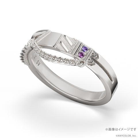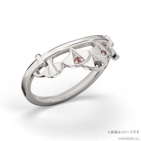 セラフ・ダズルガーデンさん監修のファッションリングは、普段の衣装をモチーフにした象徴的な模様をデザインに取り入れ、流れるようなラインで上品な印象を演出します。正面のモチーフ部分には石言葉に【情熱】・【真実】の意味を持つ「ガーネット」と、【不屈】・【成功】の意味を持つ「ブラックトリートメントダイヤモンド」を留めました。これは、常に熱い気持ちで挑戦し、チームを成功へ導くセラフさんをイメージしています。内側にはモチーフアイコンと名前(Seraph)を刻印し、素材はシルバー925です。幅広いサイズ展開で、お好きな指に着用可能です。別売りのアクリルジュエリースタンドに飾ることも楽しめます。1点購入につき、撮り下ろしビジュアルを使用した複製メッセージ付きポストカードを1枚プレゼントします。