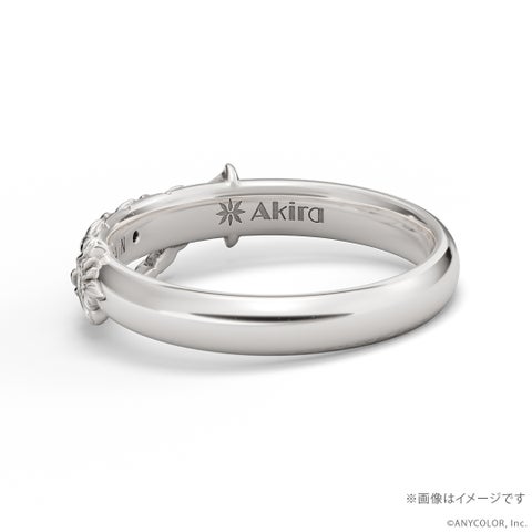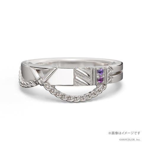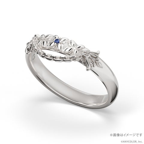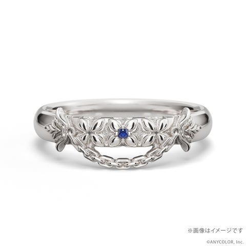 四季凪アキラさん監修のファッションリングは、普段の衣装をモチーフにしたチェーンや象徴的な模様を取り入れています。丸みを抑えたクールなフォルムが魅力のデザインです。リング中央には石言葉に【誠実】・【知性】・【成功】の意味を持つ「ブルーサファイア」を留め、揺るぎない心で物事に向き合い、時に冷静にチームを正しい方向へ導く四季凪さんをイメージしました。内側にはモチーフアイコンと名前(Akira)を刻印し、素材はシルバー925です。幅広いサイズ展開で、お好きな指に着用可能です。別売りのアクリルジュエリースタンドに飾ることも楽しめます。1点購入につき、撮り下ろしビジュアルを使用した複製メッセージ付きポストカードを1枚プレゼントします。
