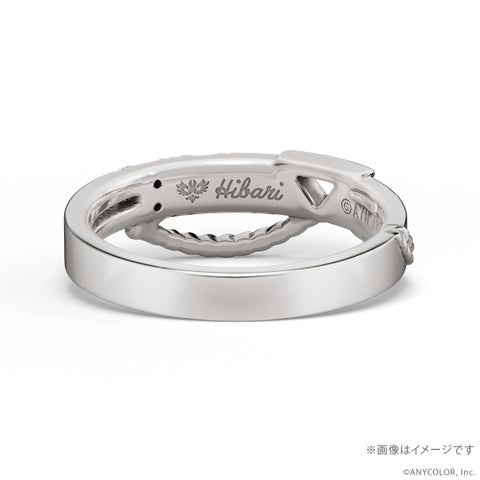 渡会雲雀さん監修のファッションリングは、ストレートの平打ちをベースに、ポイントで透かしを施し遊び心をプラスしました。普段の衣装をモチーフにしたチェーンや象徴的な模様をデザインに落とし込んでいます。心の平和や安定をもたらす「アメシスト」と、前向きなエネルギーを高める「ロードライトガーネット」を使い、チームのムードメーカーとして活躍し、常に明るい渡会さんをイメージしました。内側にはモチーフアイコンと名前(Hibari)を刻印し、素材はシルバー925です。幅広いサイズ展開で、お好きな指に着用可能です。別売りのアクリルジュエリースタンドに飾ることも楽しめます。1点購入につき、撮り下ろしビジュアルを使用した複製メッセージ付きポストカードを1枚プレゼントします。