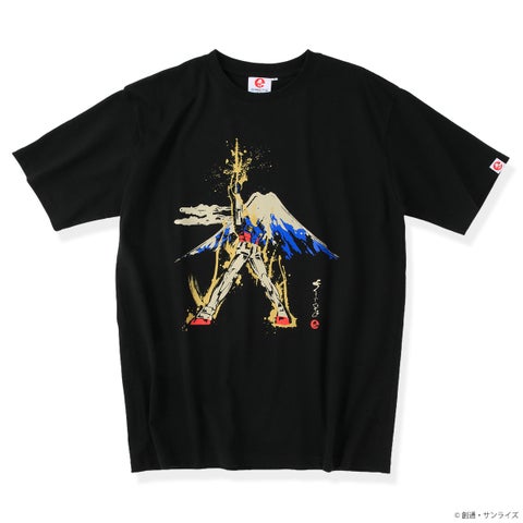 今回の静岡限定グッズには、富士山を背景にラストシューティングポーズをとるガンダムを、躍動感あふれる筆絵タッチで描いた特別なデザインを採用しています。このユニークなデザインは、Tシャツ、湯呑、アクリルキーホルダーの3アイテムに展開されます。