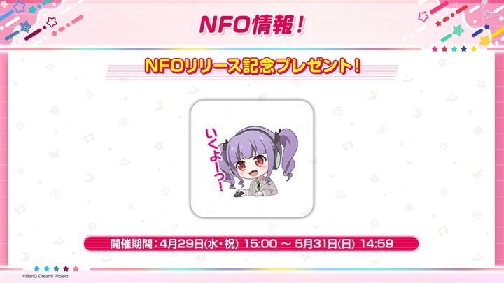 - 期間中にログインすると、「NFO」リリース記念スタンプを受け取れます。