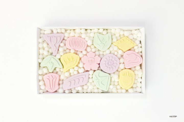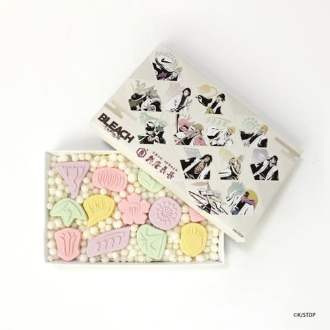 本商品は、TVアニメ『BLEACH 千年血戦篇』に登場する護廷十三隊の13の隊花をモチーフにしています。菊、翁草、金盞花、竜胆、馬酔木、椿、菖蒲、極楽鳥花、白罌粟、水仙、鋸草、薊、待雪草といった隊花を、特注の型で一つ一つ忠実に形作りました。淡いパステルカラーで彩られた和三盆は、繊細な口どけとともに、その見た目でも楽しませてくれます。13人の隊長と隊花が描かれたオリジナル小箱も、作品の世界観をさらに深めます。