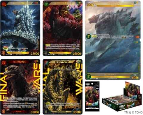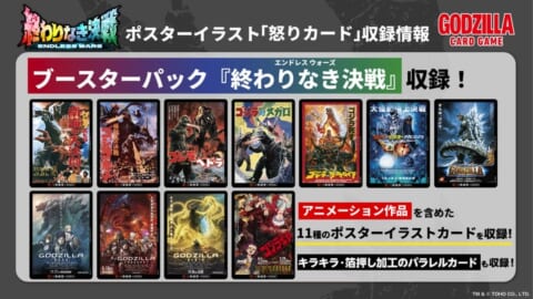 また、ブースターパック『終わりなき決戦』には、アニメーション作品を含む歴代ゴジラ作品のポスターデザインを使用した11種類の「怒りカード」を収録。キラキラ・箔押し加工のパラレルカードも封入されています。