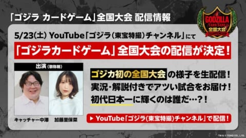 2026年5月23日(土)にYouTube「ゴジラ(東宝特撮)チャンネル」にて、全国大会の様子が生配信されます。東京・福岡・名古屋・札幌・大阪で開催された全国大会予選を勝ち抜いた16名による決勝大会の模様を、キャッチャー中澤氏、加藤里保菜氏が出演して届けます。