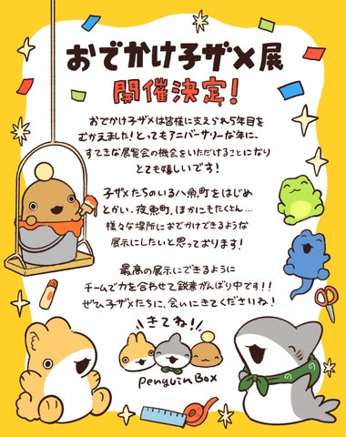 ペンギンボックス氏からは、作品5周年と展覧会開催へのお祝いコメントとイラストが寄せられました。コメントでは、八魚町をはじめとした様々な場所へおでかけできるような展示を目指していることが語られています。