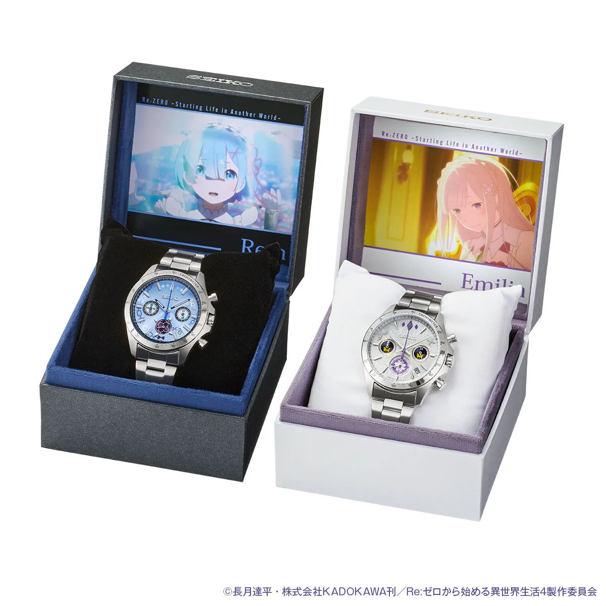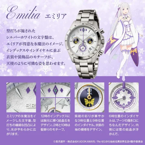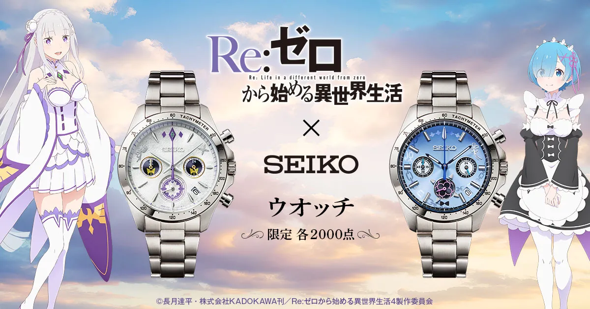 Re:ゼロから始める異世界生活と日本を代表する腕時計メーカー・セイコーのコラボレーションにより誕生したクロノグラフモデルは、ヒロインのエミリアとレムをそれぞれイメージした2種類で展開します。