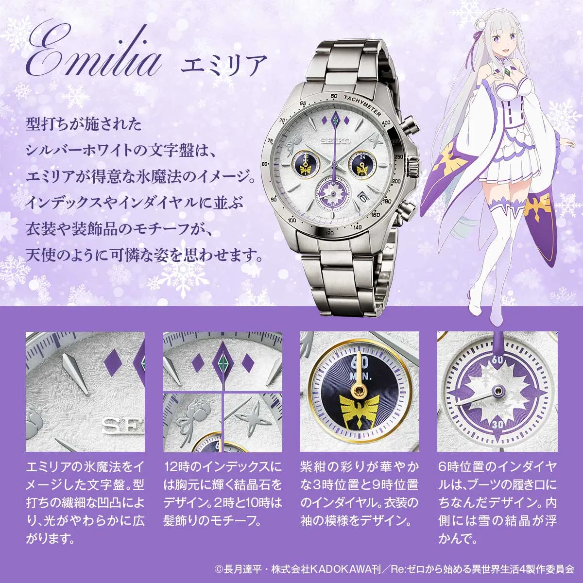 文字盤のインデックスには、エミリアにちなんだモチーフが配置されています。12時には胸元に輝く結晶石、2時と10時には髪飾りのモチーフをデザイン。さらに、6時位置のインダイヤルにはエミリアの純真な美しさを表現した雪の結晶がちりばめられています。