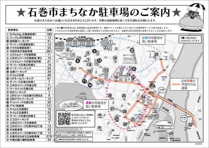 ゴールデンウィーク期間中は多数のイベントが開催されるため、石巻市街地の駐車場および道路の混雑が予想されます。車で市街地まで進行すると渋滞に巻き込まれる可能性もあるため、比較的空いている石巻駅周辺の有料駐車場に駐車することをおすすめします。
