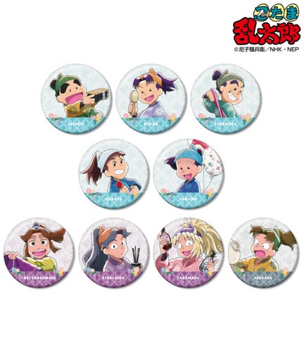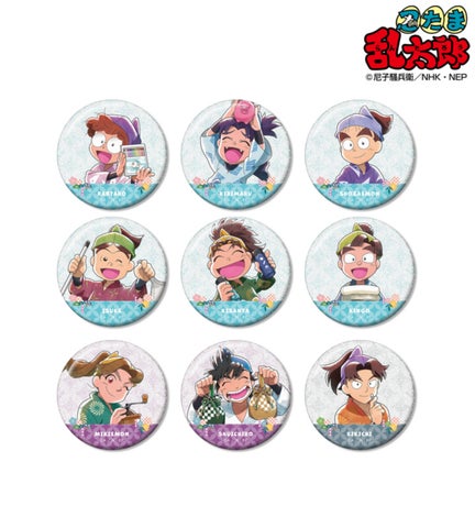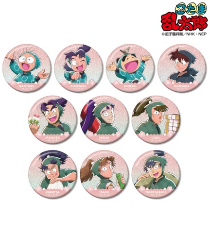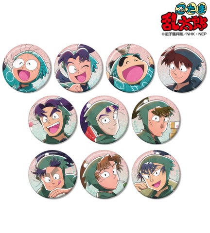 猪名寺乱太郎、摂津のきり丸、黒木庄左ヱ門、二郭伊助、山村喜三太、皆本金吾、田村三木ヱ門、浜守一郎、山田利吉、福富しんベヱ、加藤団蔵、佐武虎若、笹山兵太夫、夢前三治郎、平滝夜叉丸、綾部喜八郎、斉藤タカ丸、小松田秀作といったキャラクターの描き下ろしイラストをグリッター加工で仕上げた缶バッジです。