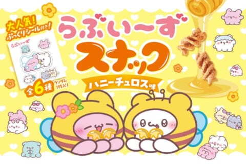 お菓子本体は、「らぶいーず」の可愛らしい世界観に合わせ、ハニーチュロスをイメージして開発されたオリジナル商品です。キャラクターシールを集める楽しみと、ハニーチュロス味のスナックを味わう体験を同時に提供します。