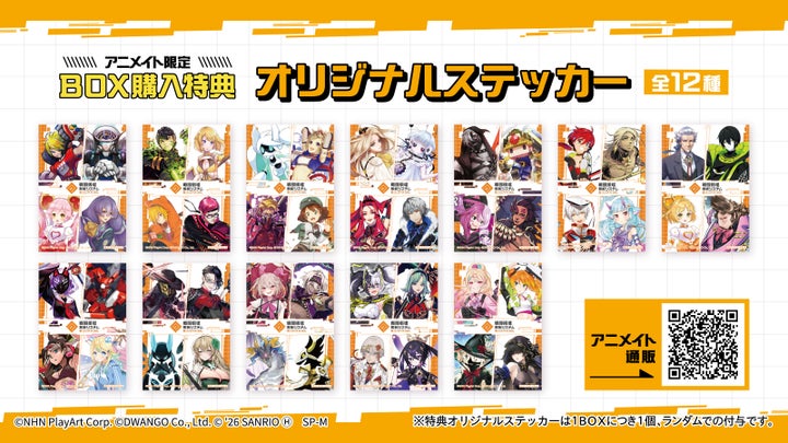 アニメイト店頭およびアニメイト通販にて、1BOXご購入のお客様には購入特典として「オリジナルステッカー」を1枚プレゼントします。ステッカーは全12種類の中からランダムで1枚が封入されます。