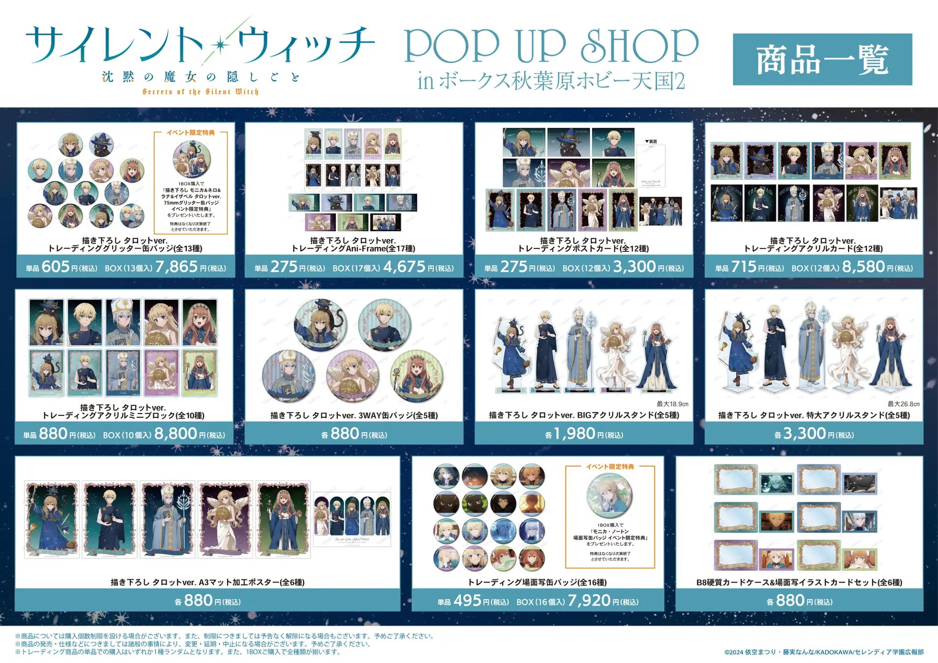 今回のPOP UP SHOPでは、「タロット」をコンセプトに描き下ろされたイラストを使用したグッズや、作中の場面写を使用したグッズが多数先行販売されます。各商品は税込み価格で提供されます。