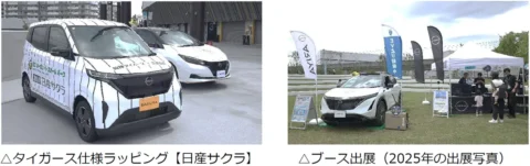 冠協賛社である兵庫日産自動車は、タイガース仕様に特別ラッピングされた「日産サクラ」や新型「日産リーフ」、「日産アリア」などの電気自動車(EV)を展示します。兵庫日産ブースでは、EVから給電された電気を使用するエアー抽選会を実施。その他一部のブースでも日産自動車のEVから供給される電力で運営します。