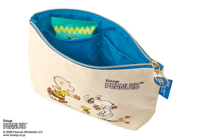 ポップアップ付きボックスとお揃いのデザインが可愛いポーチと、スヌーピー シュガーバターの木 詰合せ 12個入がセットになった商品です。内ポケットやマチが付いた帆布素材のポーチで、使い勝手も抜群です。