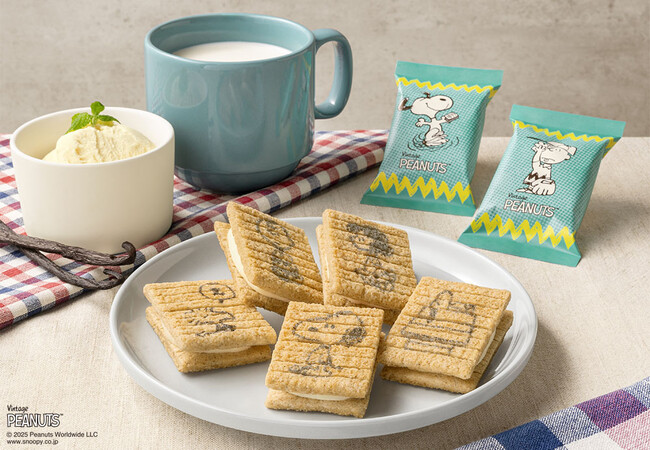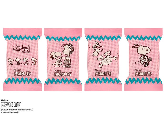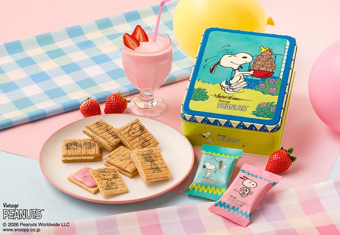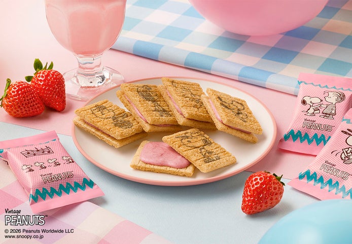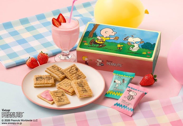 今回のポップアップストアでは、春夏新作フレーバー『ストロベリーシェイク風』が登場します。あまずっぱいストロベリーショコラを、国産生乳の練乳パウダーを合わせたシリアル生地でサンドしたデザートサンドです。お菓子本体には5種類、個包装には4種類のスヌーピーと仲間たちのデザインをランダムに施しています。