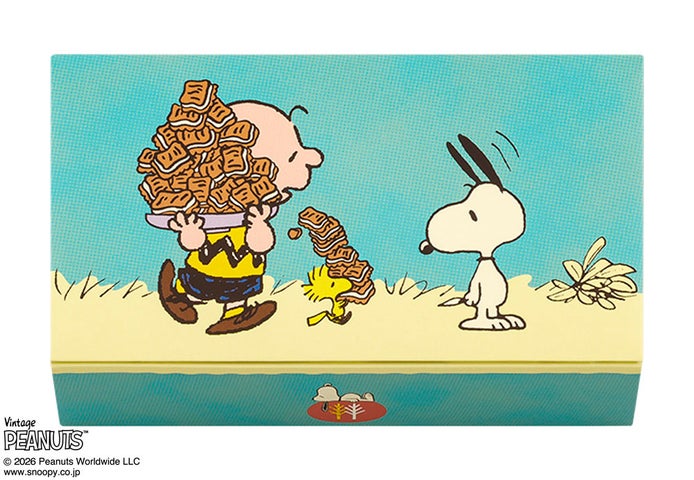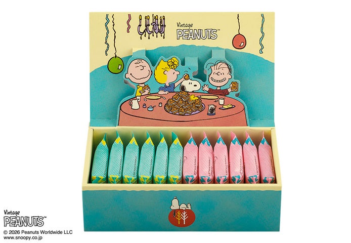 スヌーピー、チャーリー・ブラウン、サリー、ライナスが飛び出すポップアップ付きボックスです。シュガーバターの木を囲んでパーティーを楽しむハッピーなアートワークが魅力です。定番『スヌーピー シュガーバターサンドの木』と春夏限定『ストロベリーシェイク風』の2つの味が楽しめます。