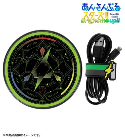 ワイヤレス充電器は、Switchらしい幻想的な世界観を想起させる、天体と魔法陣をイメージしたデザインを施しています。さらにLEDライトが内蔵されており、電源を接続すると青と緑に点灯します。ラバー製のケーブルバンドは、衣装のベルトをモチーフに、ゲームのようなドット絵風デザインが特徴です。