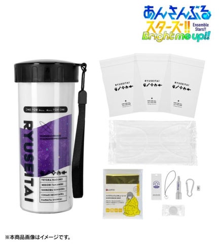 ユニット名やメンバー名をあしらったボトルに、ホイッスルやライトなど計6種類の防災グッズを詰め込みました。宇宙が広がる「アンリミテッドギャラクシー」のデザインシートなど、ユニットらしさと実用性を両立させています。